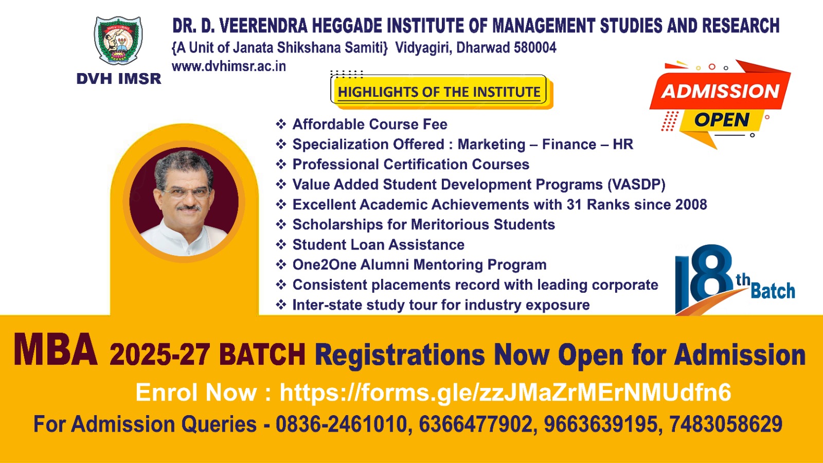 Dr. D.Veerendra Heggade Institute of Management Studies and Research was founded with this thought to bridge the gap between industry & academia. DVHIMSR is part of Janata Shikshan Samiti (JSS) group of institutions, which is one of the most reputed groups of educational institutions in North Karnataka the Samiti has played an active role in empowering people and bettering the lives of communities in North Karnataka.